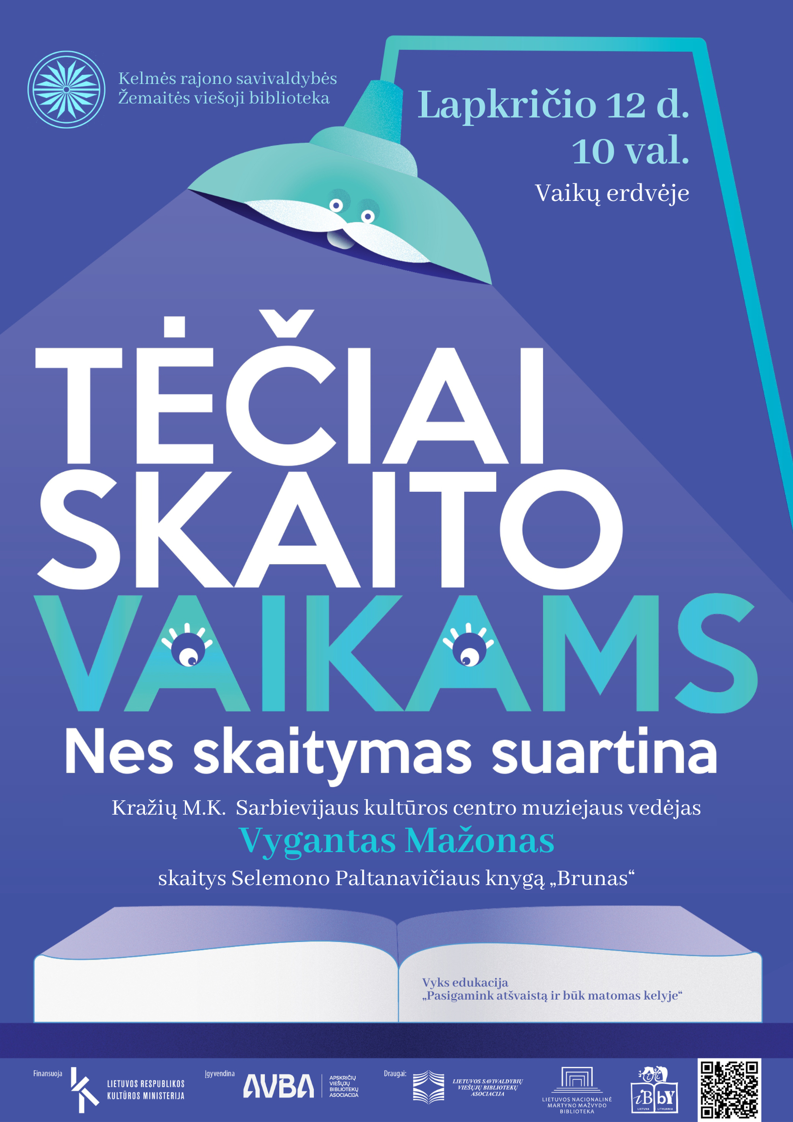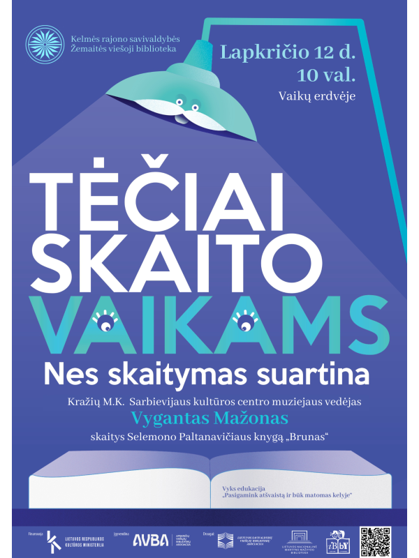 Lapkričio 12 d. 10 val. bibliotekos vaikų erdvėje Kražių M.K. Sarbievijaus kultūros centro muziejaus vedėjas Vygantas Mažonas skaitys Selemono Paltanavičiaus knygą „Brunas“.